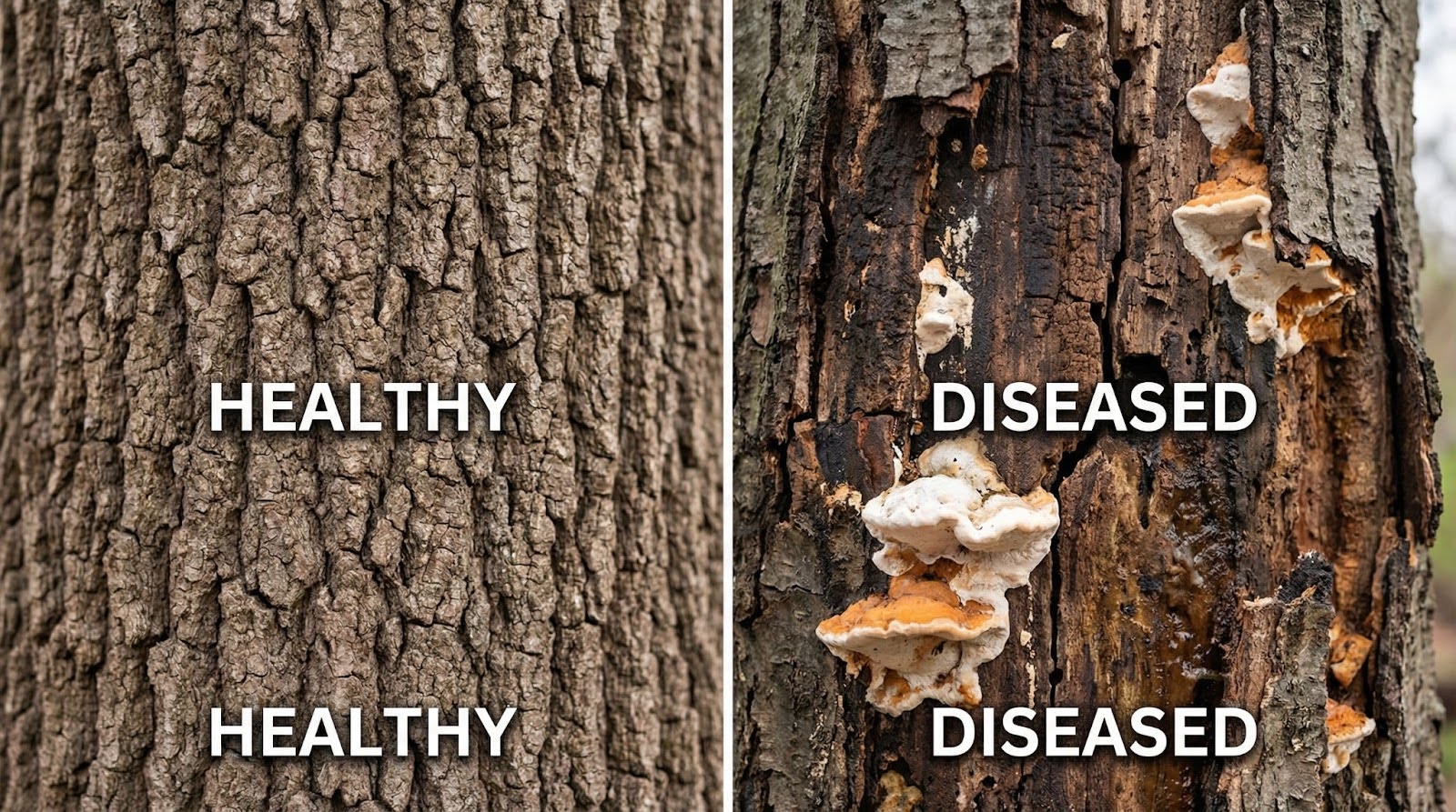 - Root systems and soil around the base, including fungi, soft spots, or heaving that show deeper problems.